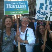 Marnie Glickman (left), managing director of the Green Party of California, Terry Baum (center), Green Party candidate for Mayor of San Francisco, and Sue Vaughan (right), Terry's campaign manager at Occupy San Francisco on 10/15/11.