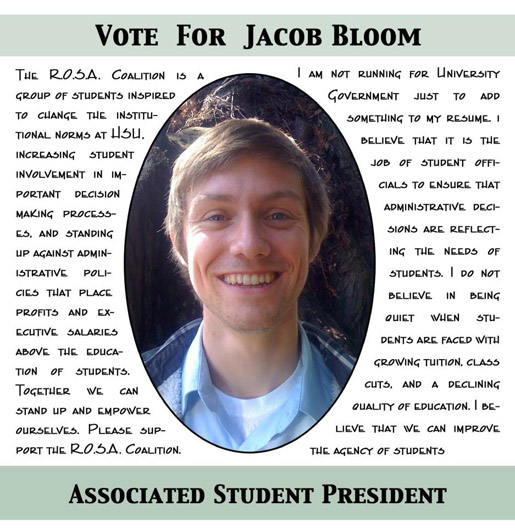 Twenty-two year old Green Jacob Bloom was elected Associated Students president at Humboldt State University in elections held between May 1st and 2nd. A communication major, Bloom ran as part of a nine candidate slate from the Revolutionary Organization of Students for Action (ROSA). All were elected.